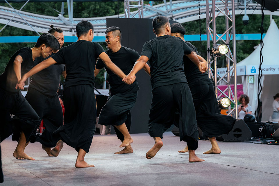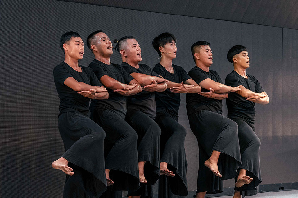 來自花蓮的「TAI身體劇場」帶來在2013年首演的作品《Tjakudayi・我愛你怎麼說》,舞者們身著黑衣緩慢移動身體,從沉穩的念誦低吟到高亢引吭、齊聲高歌皆是清唱,搭配隨之加快的踩踏聲,即便周邊場館仍歡騰喧鬧,臺灣館此時的「靜」已讓現場聽不懂歌詞的法國觀眾說,「非常感動,體會到一股平靜力量及人與人間的情感連結」。