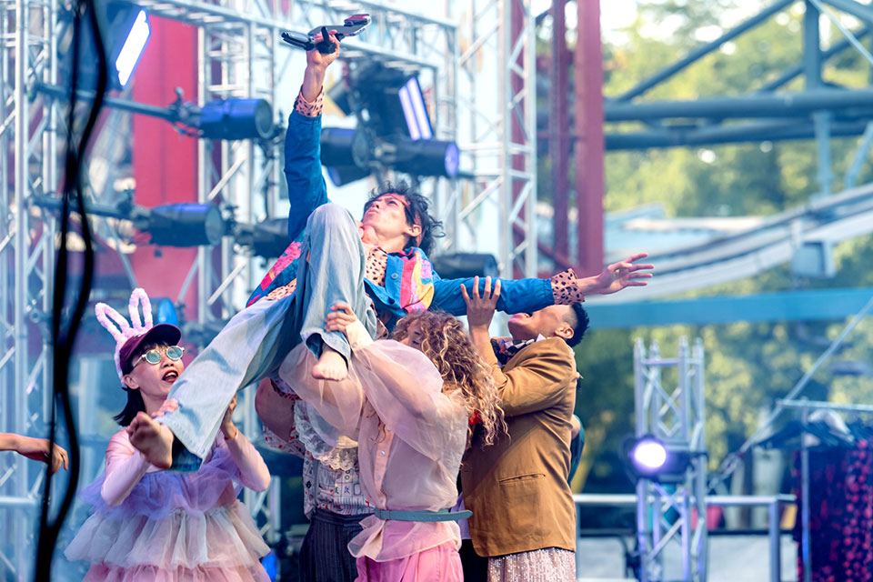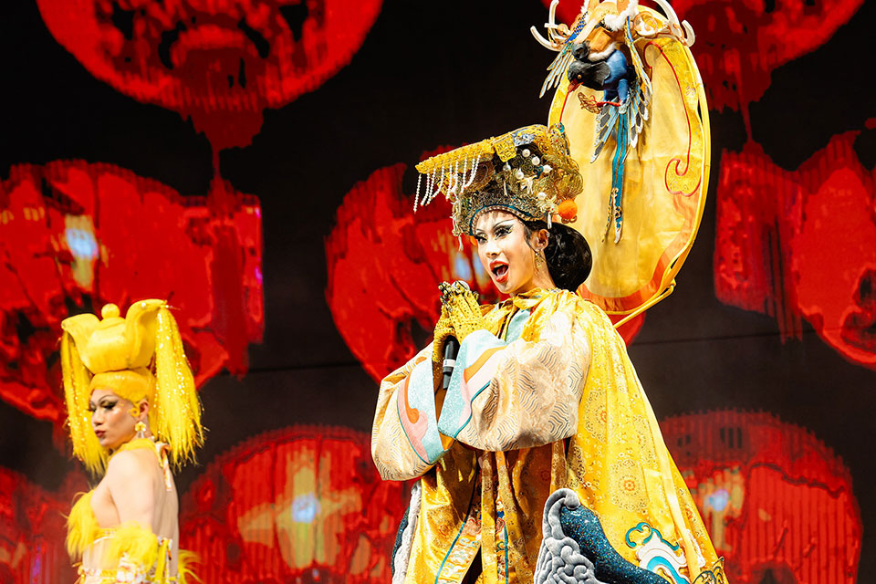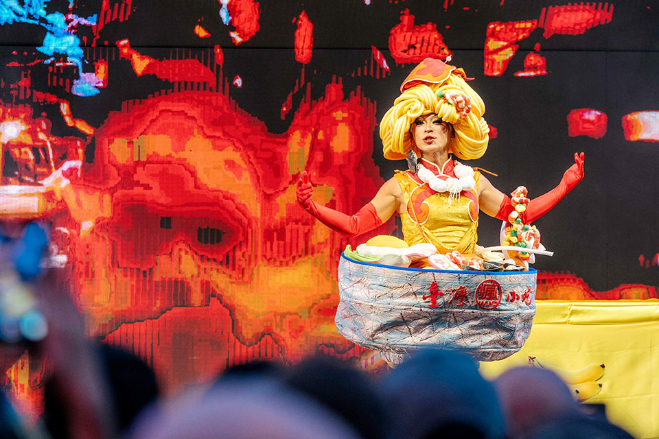 眾所期待的「妮妃雅與瘋家」在昨晚首登場,呼應《寶島富麗秀》主題,不論是表演者的扮相、大螢幕的視覺或是搭配的音樂,都很「臺灣」,像是在鄧麗君〈高山青〉與張惠妹〈站在高崗上〉嘹亮歌聲襯托下,瘋家女兒掀起的黃色蓋頭竟是茶壺髮型,翠綠的茶園背景搖成珍珠奶茶,舞者也現場手搖應景;螢幕上觀光夜市牌樓一現,各式小吃盡出,小籠包、水果盤、烤香腸,不只在螢幕上,更裝扮在舞者身上,搭配李愛綺〈迺夜市〉與電音舞曲,現場發放水果造型氣球,臺灣館搖身成為正宗的夜市現場。