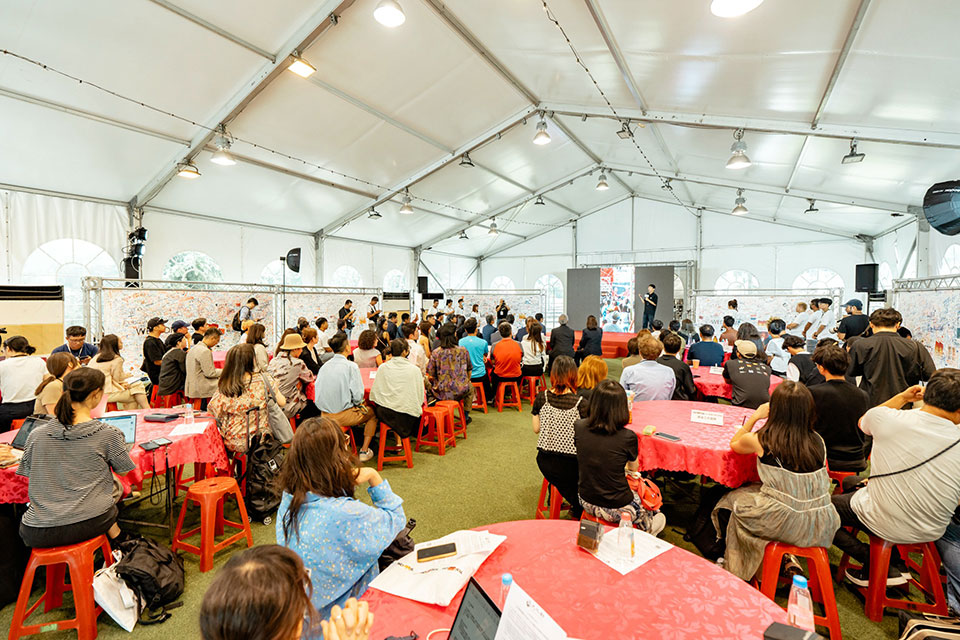 為了還原巴黎現場,營造身歷其境氣氛,分享會特別復刻文化奧運臺灣館,以大舞台、紅圓桌、紅椅頭佈置出拉維特園區內廟埕辦桌的情境,更架起從巴黎原裝空運返臺的簽名布條,上面寫滿「臺灣加油」、「Taïwan mon amour」、「I love Taiwan」的留言,呈現臺灣館在文化奧運期間所收到來自世界各國朋友的親筆祝福。