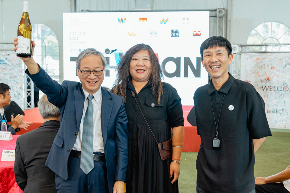 製作行政統籌吳季娟則笑稱自己是國際級總機小姐,跨組、跨國協調各種問題與解方,她哽咽地說,謝謝臺灣、文化部與每一個夥伴,因為有每一個人的相信及付出,「所以我們相聚在這裡」。吳季娟最後驚喜向文化部長李遠獻上由法國技術夥伴特製、印有「Pavillon Taïwan」字樣酒標的白酒,展現此次「臺法同心、其利斷金」,充滿愛、溫暖與默契的完美合作。